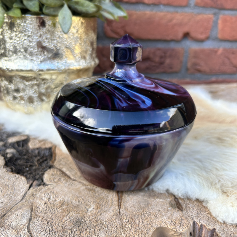 Marmorite tabakspot in paars( gemarmerd)Prachtige marmorite bakje met deksel( waarschijnlijk onderdeel van een tabaksstel) uitgevoerd in persglas in donkerpaars met witte marmering.