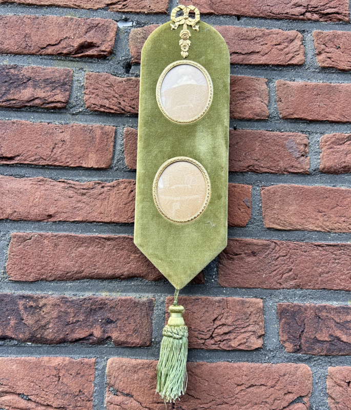 Antieke groene fluwelen wandhanger voor 2 foto's met kwastDeze antieke fluwelen wandhanger voor 2 foto's is uitgevoerd in lichtgroene fluweel met bovenop een vuurvergulde strikdecoratie en om de ovalen uitspringen voor de foto's tevens een afwerking in goud metaal.