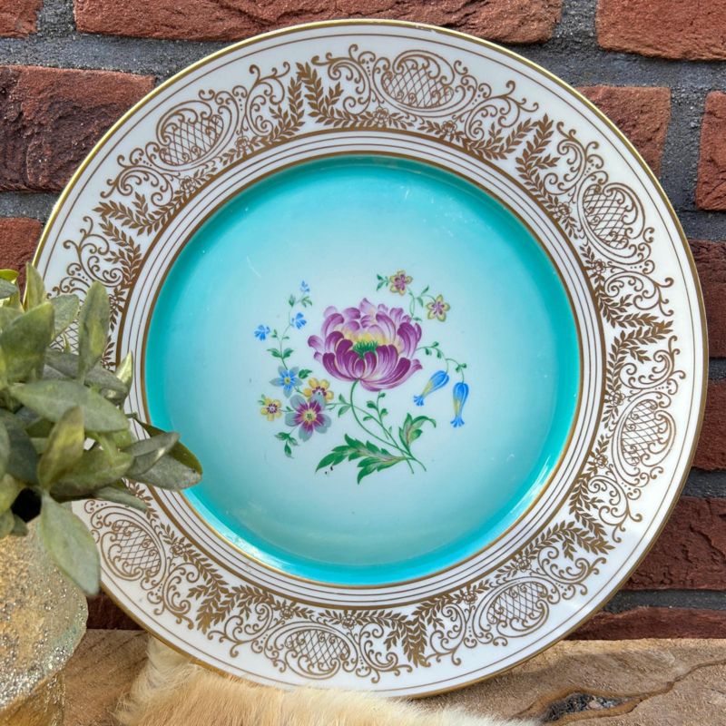 Bord porselein vergulde randdecoratie en bloemdeco in groen, 'Schwarzenhammer'Prachtig porseleinen bord met op de rand zéér gedetailleerd vergulde gouden decoratie. Binnenin is het bord groen( op de foto lijkt het meer blauw) met in het midden een bloemdecoratie met blaadjes. Ík zou het aan de wand…