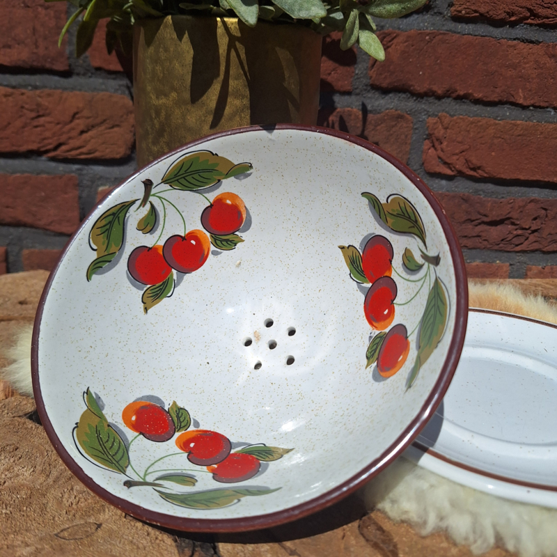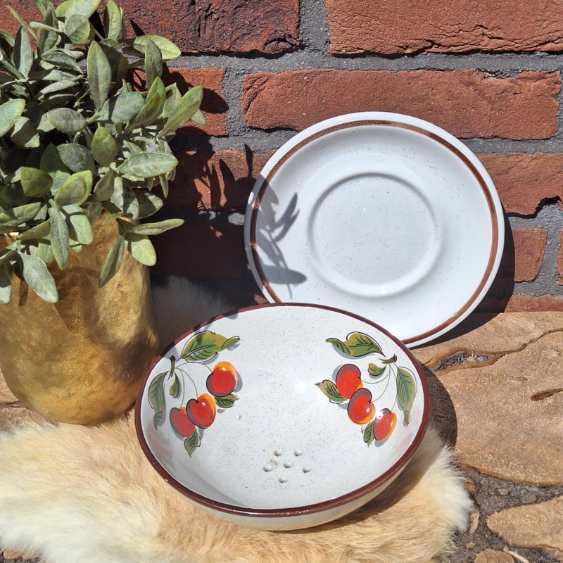 Vintage fruittest/ vergiet met schotel en kersen decor