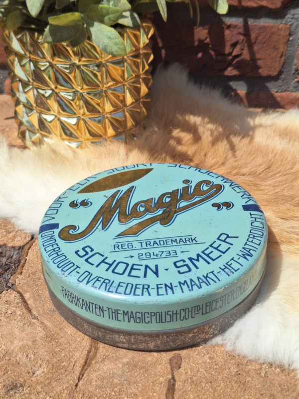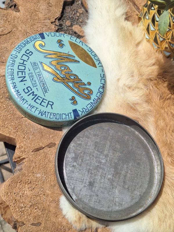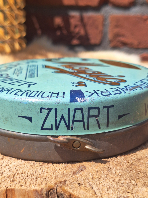 Mooi vintage blik van een schoenpoetsmiddel. Met prachtige ouderwetse sluiting, wel wat aangeslagen en gebruikersschade, maar dat maakt het blik juist mooi.