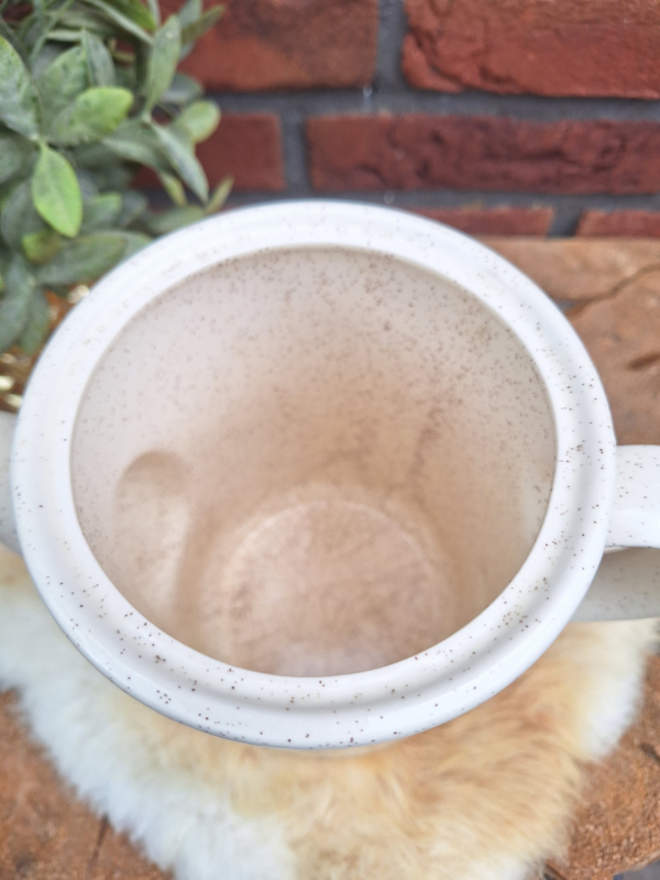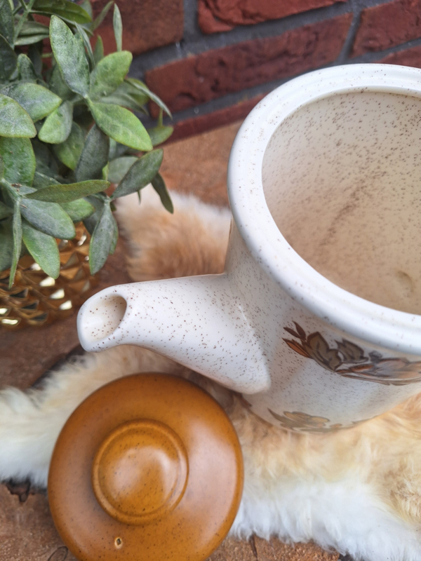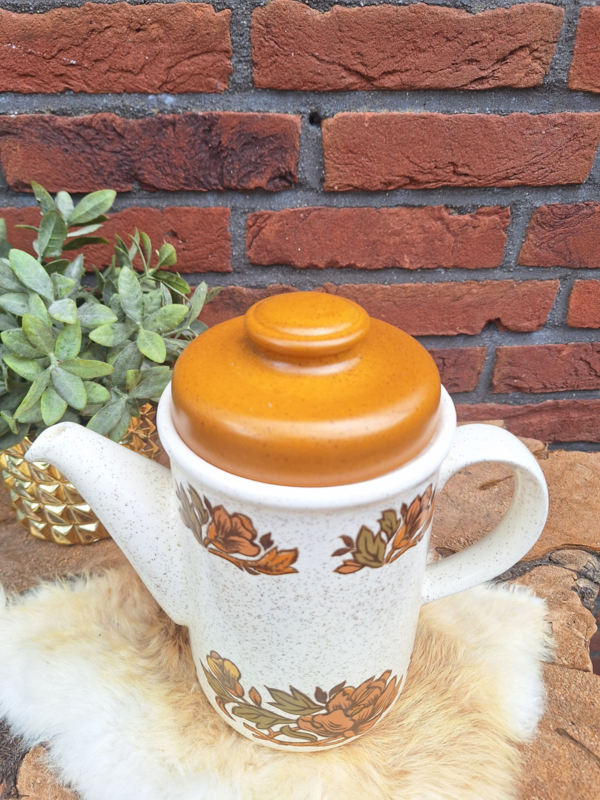 Mooie vintage keramische hoge koffiepot met een beige/ créme gespikkelde body en bruin groene bloem-en bladecor.