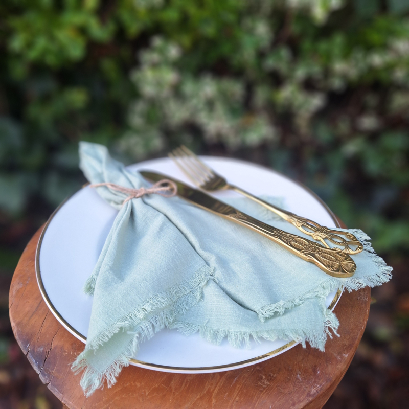 Mooie sage, sommige noemen het verbena of salie groen, stoffen servetten met leuke rafelranden in zacht katoen.