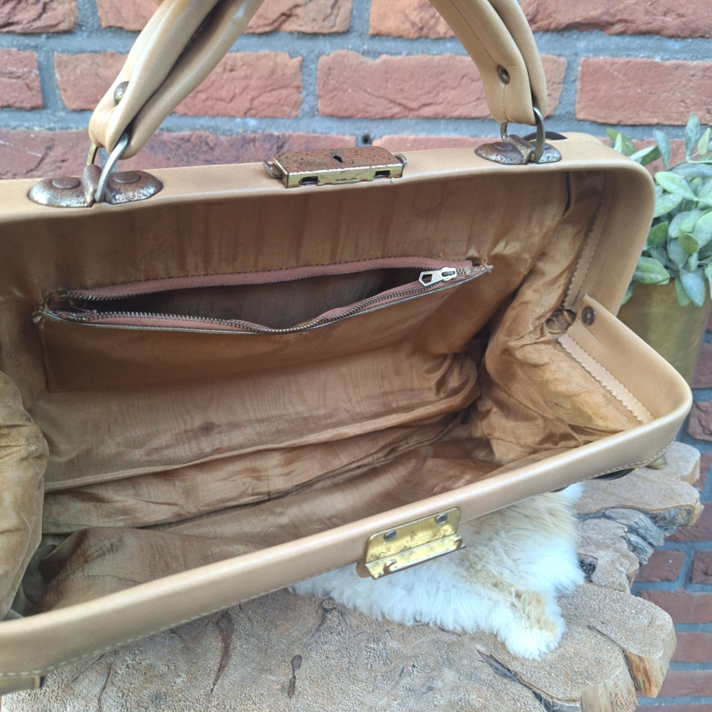 Héél mooi afgewerkt en uiteraard met de herkenbare scharnierende sluiting van een dokterstas met bovenop een brass sluiting. Het sleuteltje is aanwezig. Het materiaal is een hele mooie dikke 'skai'. Dit was vroeger de benaming van allerlei kunstleder. In deze tijd noemen we het kunstleder, kunstmatig leder of zelfs Vegan leather... De binnenzijde is gevoerd en heeft een vakje met een rits.