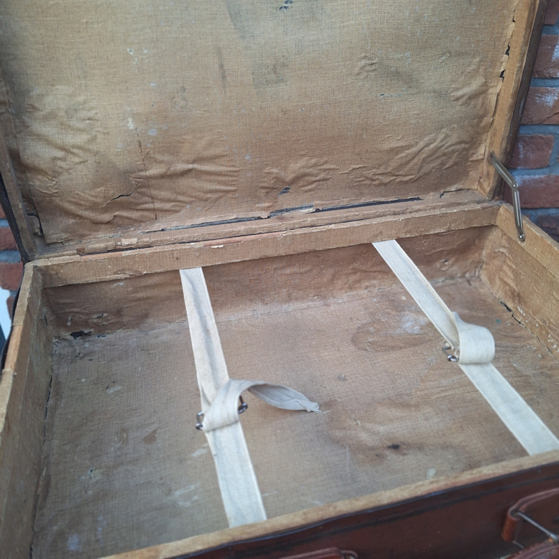 Prachtige bruine vintage koffer in een redelijk goede staat. Deze koffer van geperst karton uit de jaren 50 en heeft wel ietswat deuken in de deksel, maar ik vind dat juist de charme van dit soort koffers. Je kunt bij dit soort items altijd zo lekker wegdromen als je bedenkt waar deze koffer allemaal wel niet al geweest zal zijn, wat voor avonturen het beleeft zal hebben. De binnenzijde is bekleed met bruin papier, heeft katoenen 'spanbanden' met metalen gespen en het deksel heeft scharnieren waardoor de deksel blijft 'staan'.