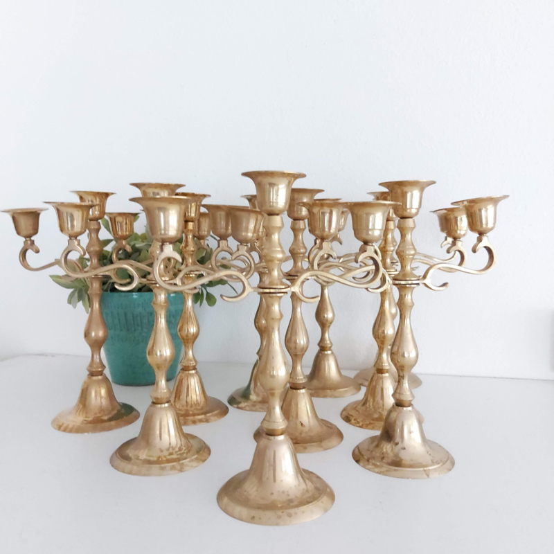Te huur: 3 armige koperen kandelaar incl. witte kaarsen