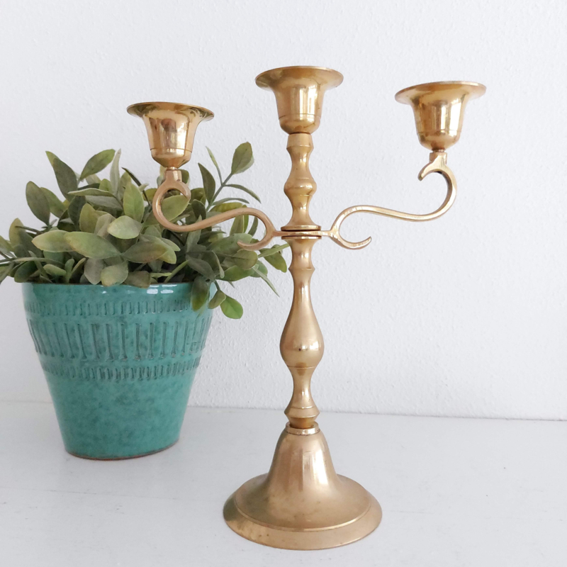 Prachtige koperen 2-armige kandelaar inclusief witte kaarsen voor uw dinertafel of ter decoratie. Hierbij leveren wij 3 witte kaarsen.