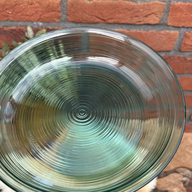Mooi glazen bord van het Franse 'Arcoroc' in een prachtige zeegroen/ turqoise kleur met van uit het midden rimpels, alsof je een steen in het water hebt laten vallen ♥ Het gaat hier om een 'diep' bord in een kleinere maat als gebruikelijk.