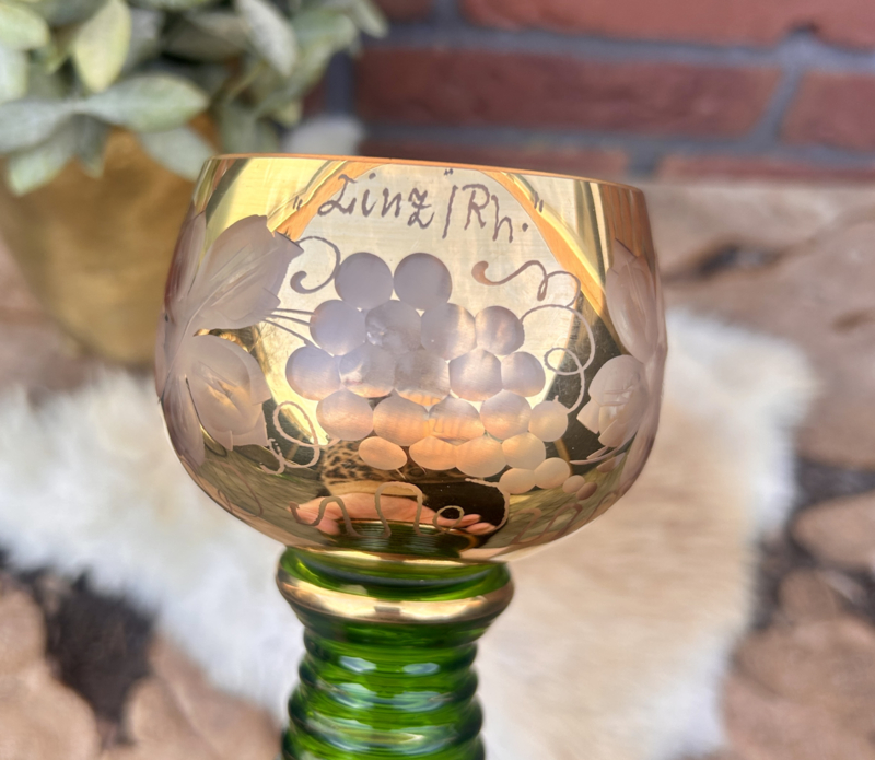 Vintage donkergroene handgemaakte Roemer glas versierd met grafeerwerk op goud van druivenbladen en ranken en de plaats van herkomst op de rand: "Linz/ Rh."
