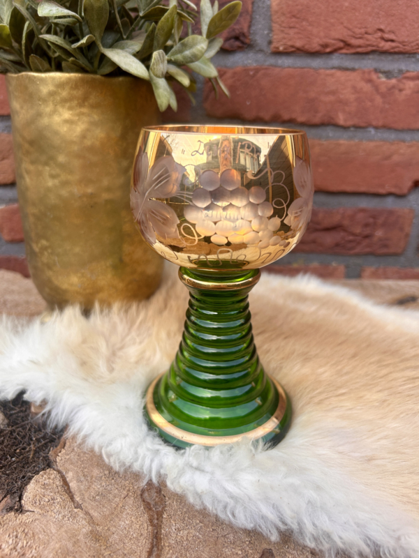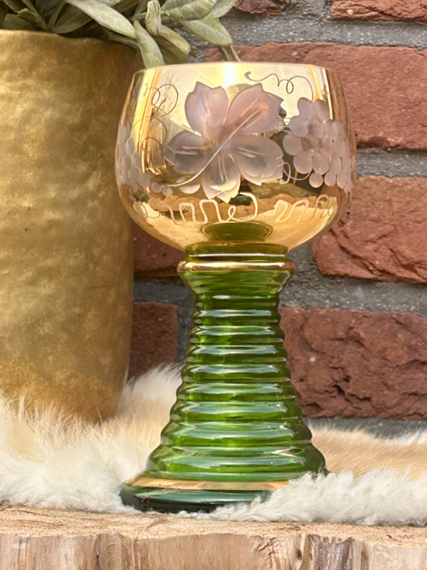 Vintage 'Roemer'(wijnglas) Groen/'Goud', handgeblazen, H 15 cm