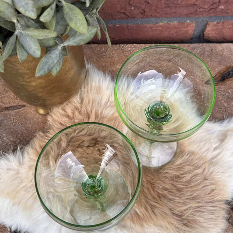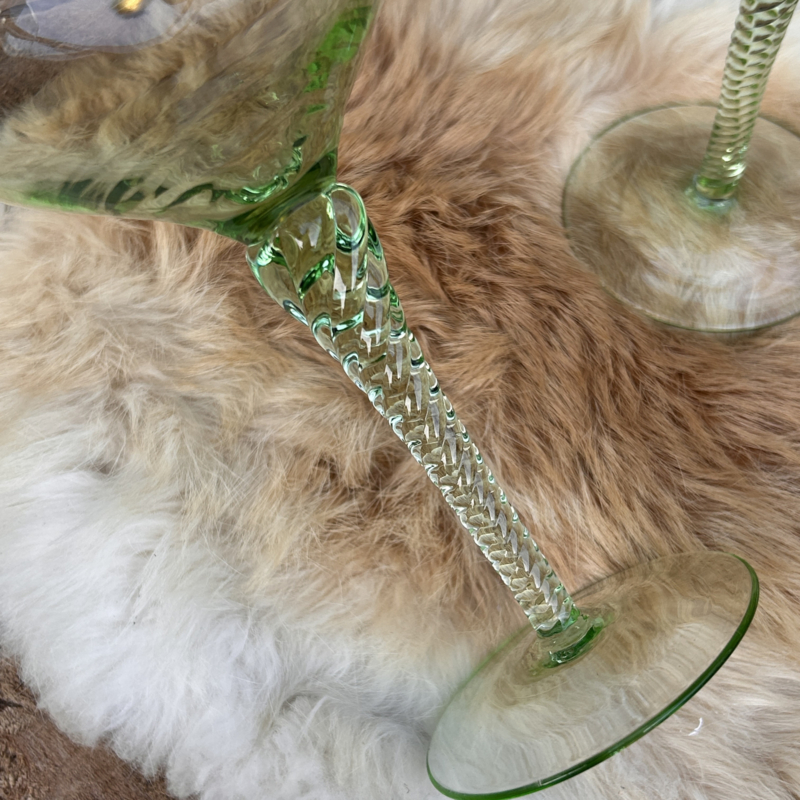 Vintage lichtgroene handgemaakte likeur/ roemer glazen waarvan de 'poten' gedraaid zijn. Héél elegant en verfijnd.