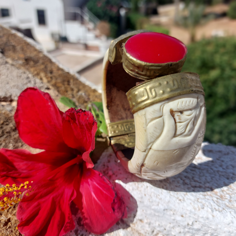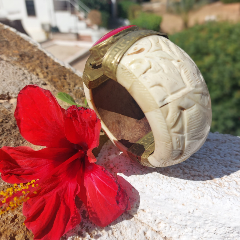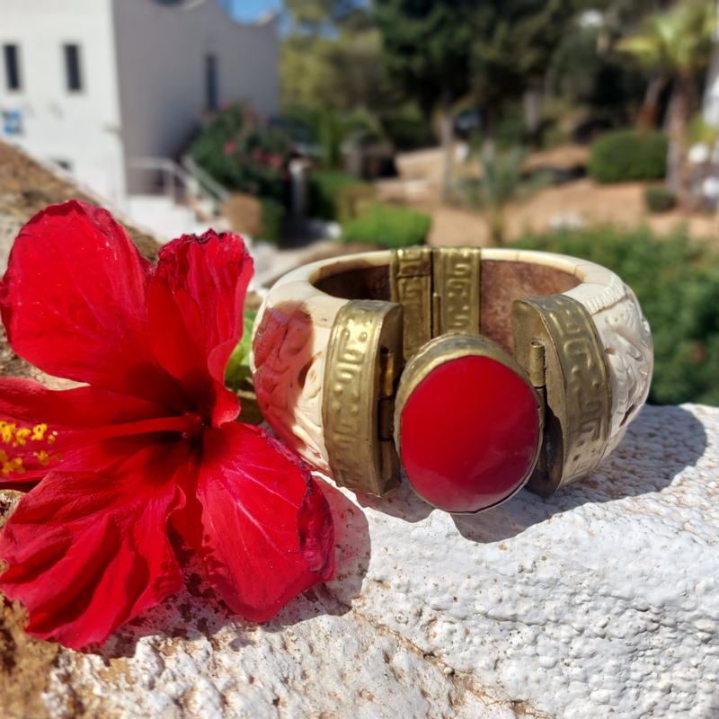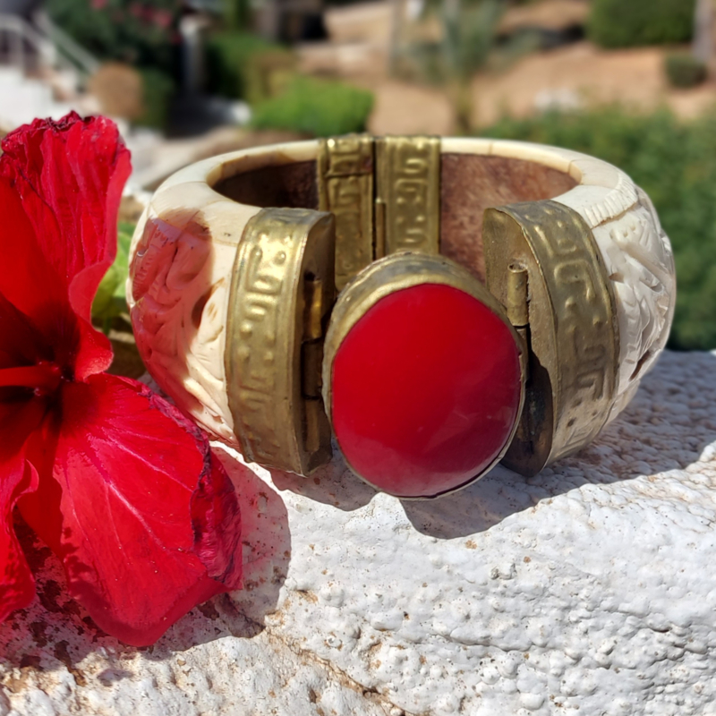 Deze fantastische Boho-Indiase armband, handgemaakt van bewerkt been en sierlijk gehamerd messing. In het middelpunt een grote cabochon van een ovale Carneool. De sluiting is een losse pin/ gat verbinding.