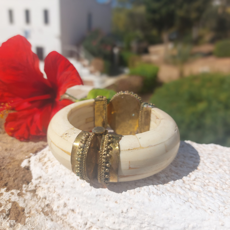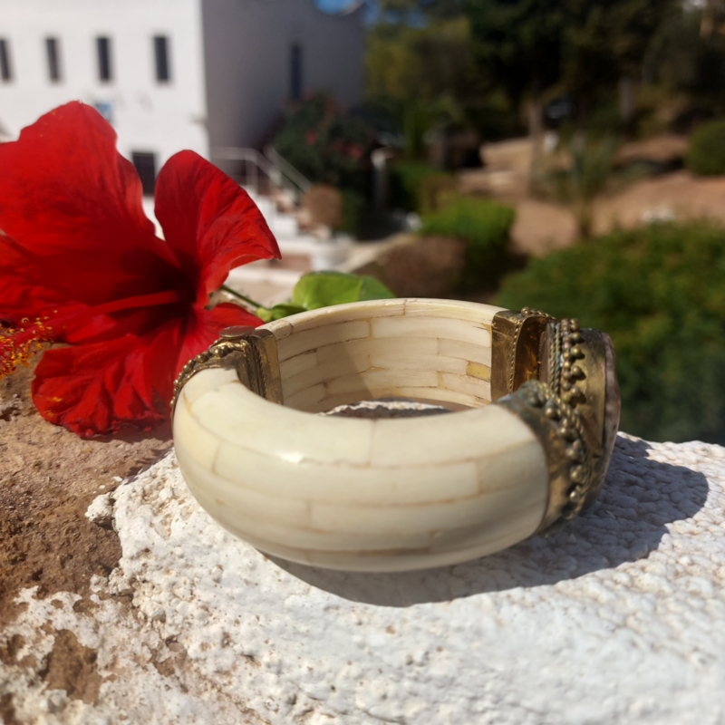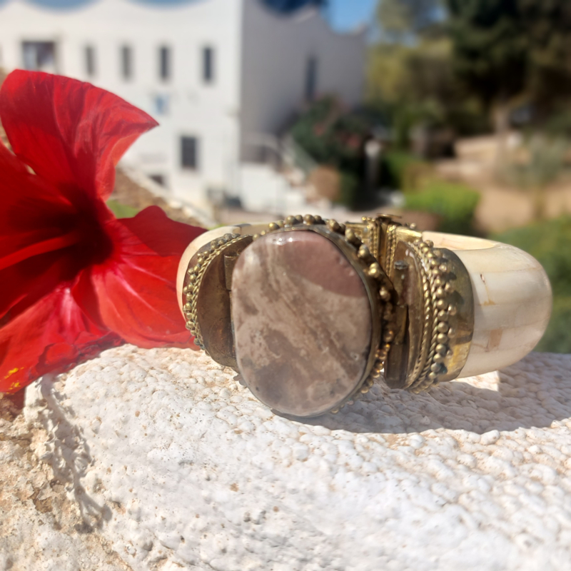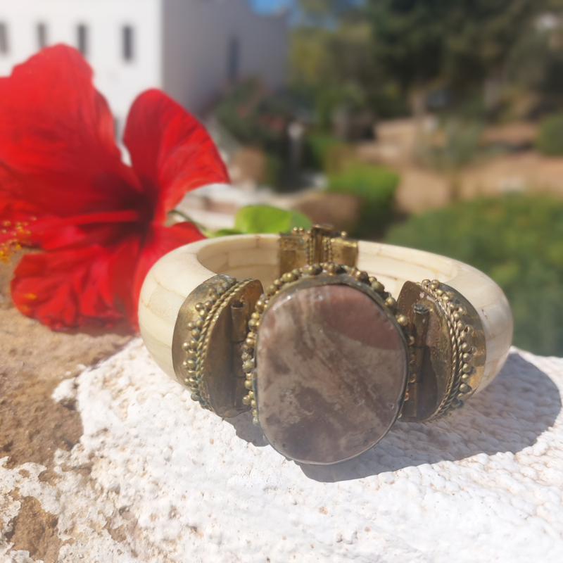 Deze fantastische Boho-Indiase armband, handgemaakt van glad been en sierlijk gehamerd messing. In het middelpunt een grote cabochon van een ovale bruine Jasper. De sluiting is een losse pin/ gat verbinding.