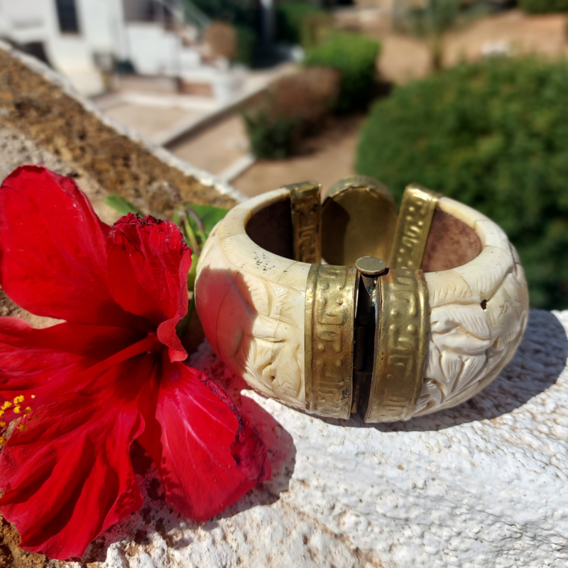 ♥Dit is één van de stukken die mijn lieve vriendin, ca. 50 jaar geleden kocht in Tibet waarmee ze vanaf de 70's reeds op de Ibizamarkt stond met nog meer van haar ingekochte sieraden en andere accesoires. Een Hollandse, maar ze woont al bijna haar hele leven op Ibiza en nu zij op leeftijd is verkoopt zij mij nu, zo nu en dan, wat van haar pareltjes.
