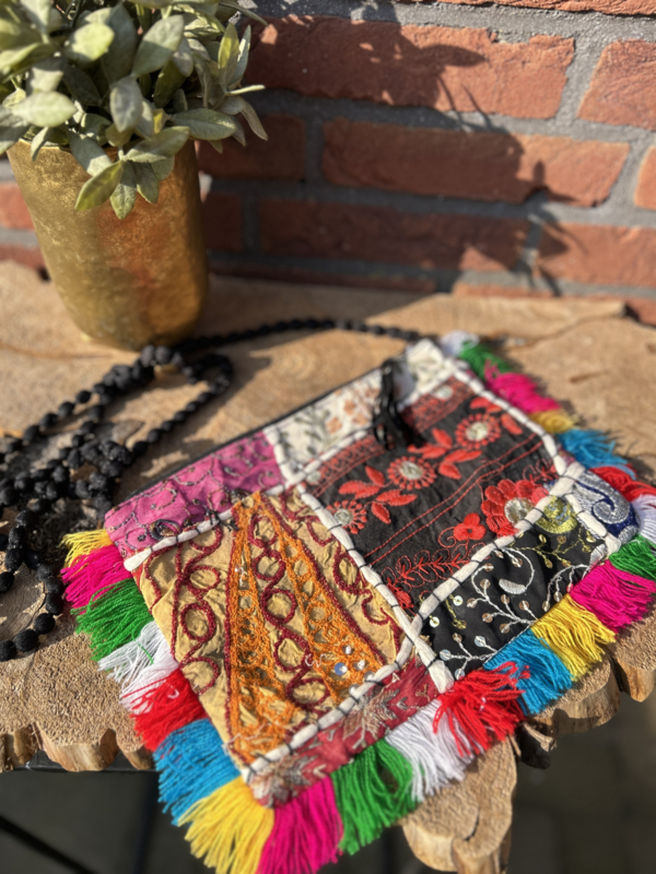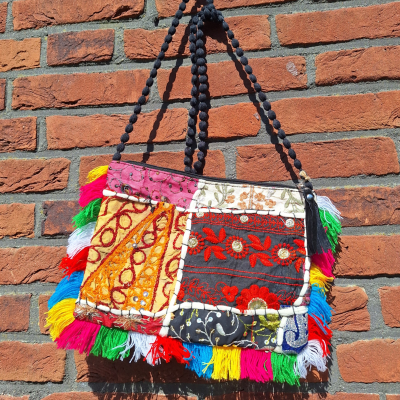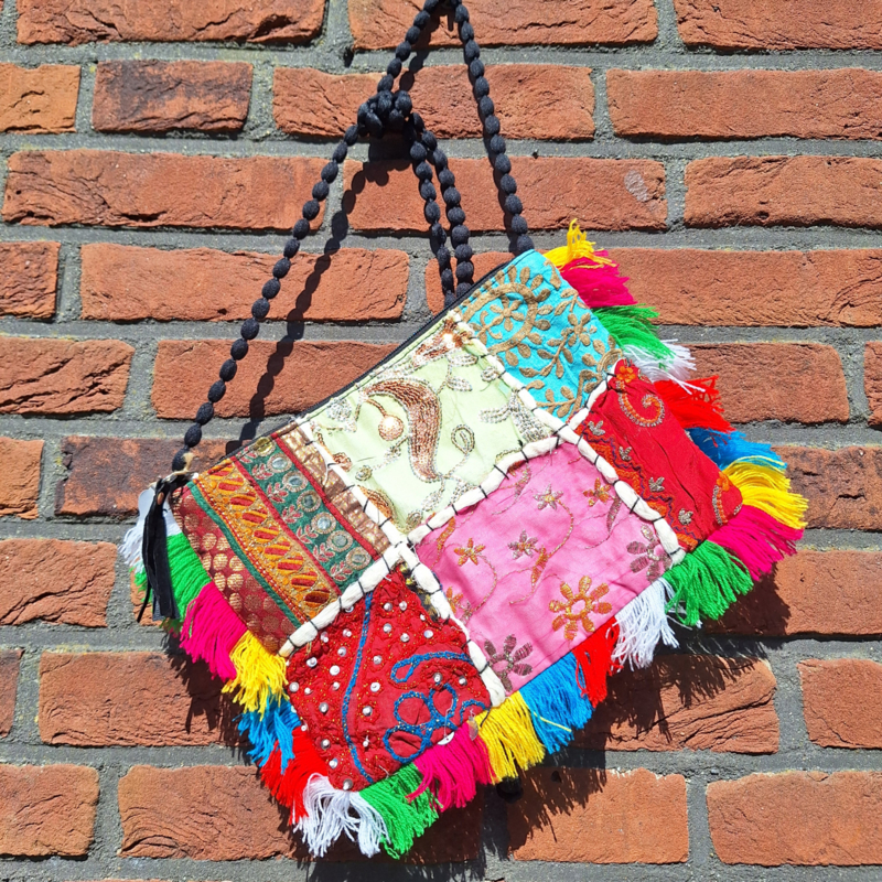 Leuk festival tasje mét rits welke je schuin kunt dragen en dansen zonder dat er iets uitvalt.Handgemaakt van allerlei stofjes en elk tasje is uniek!Herkomst: India33 x 23 cm.