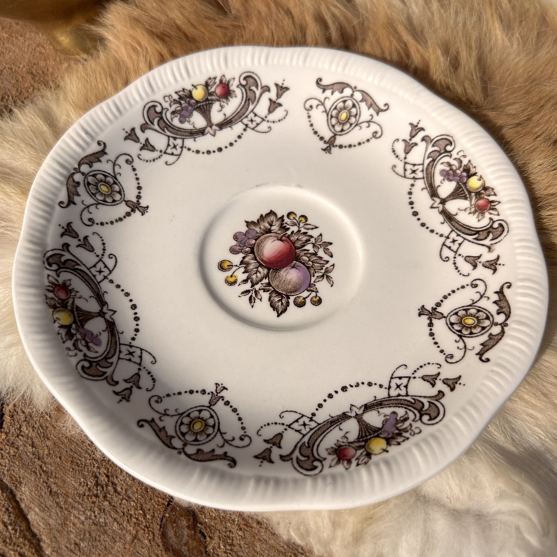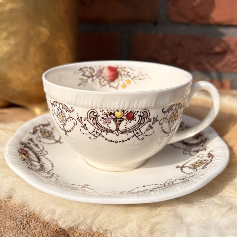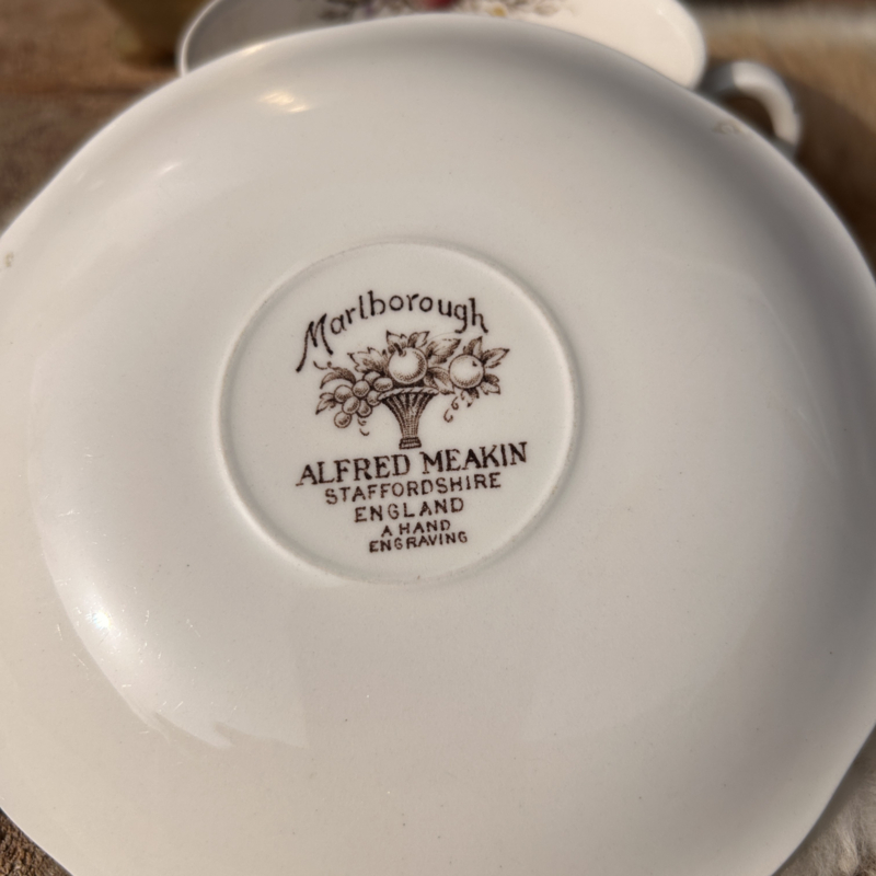 Een antieke kop en schotel van Alfred Meakin uit Engeland, specifiek uit de serie "Marlborough".