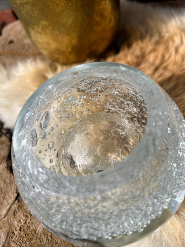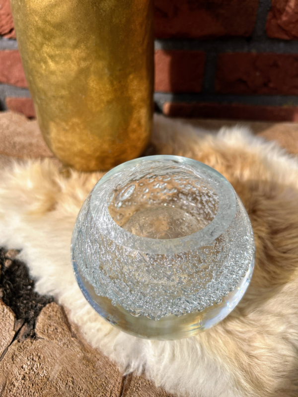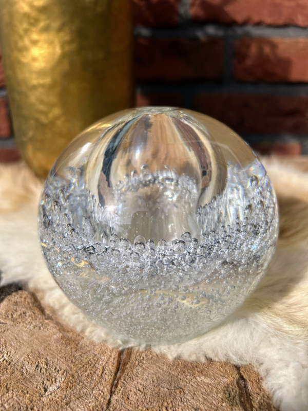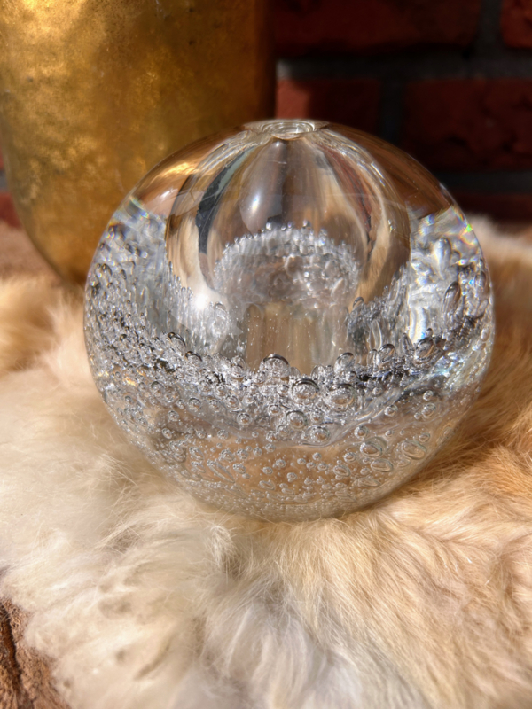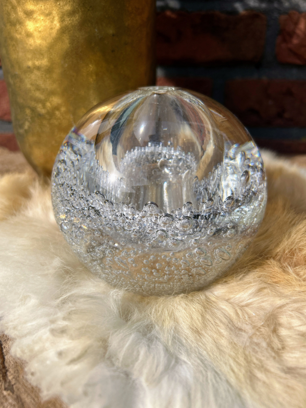 Prachtige glazen bol met binnenin een holle ruimte voor eventueel lampolie of geurstokjes olie... Natuurlijk simpelweg ook een geweldige presse-papier. De mooie bellen binnenin lijken oneindig... bijna betoverend als je er lang naar kijkt.