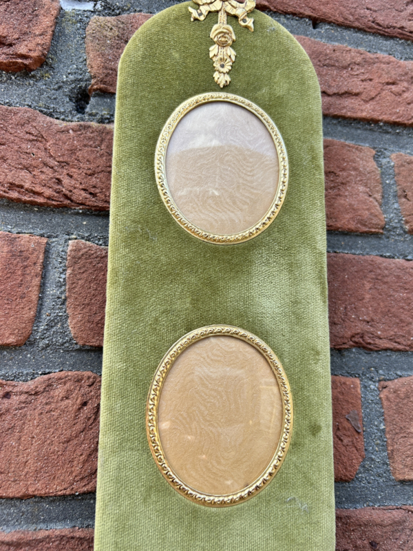 Deze antieke fluwelen wandhanger voor 2 foto's is uitgevoerd in lichtgroene fluweel met bovenop een vuurvergulde strikdecoratie en om de ovalen uitspringen voor de foto's tevens een afwerking in goud metaal.