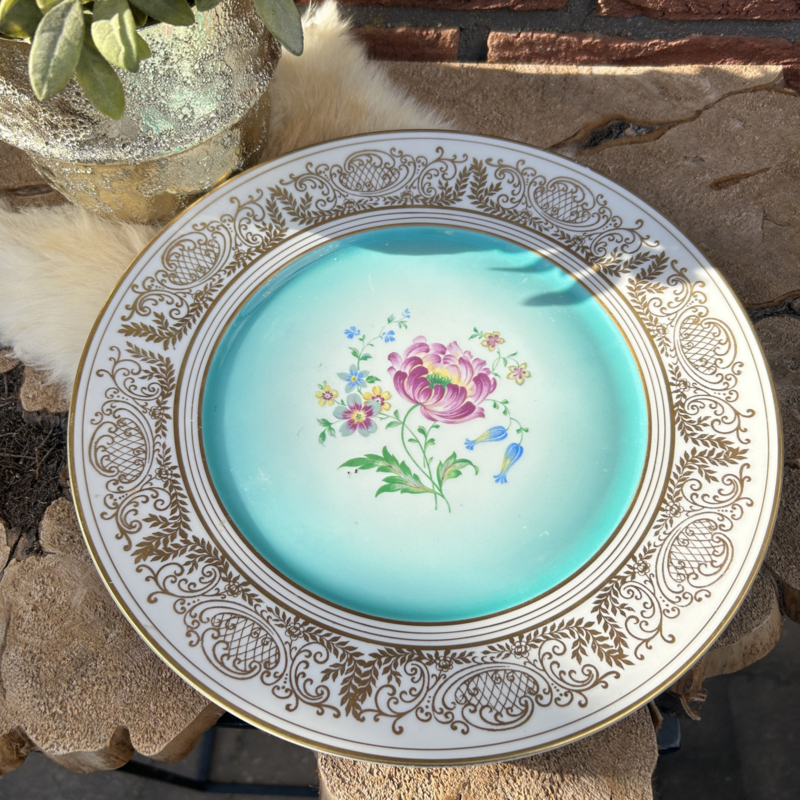 Prachtig porseleinen bord met op de rand zéér gedetailleerd vergulde gouden decoratie. Binnenin is het bord groen( op de foto lijkt het meer blauw) met in het midden een bloemdecoratie met blaadjes. Ík zou het aan de wand hangen, het is écht prachtig!