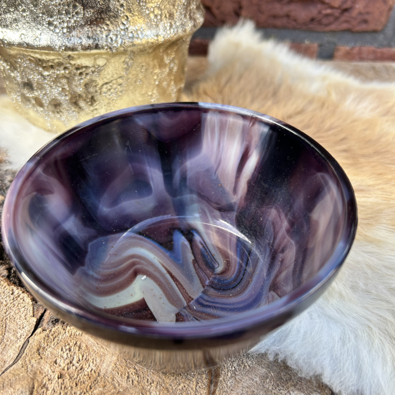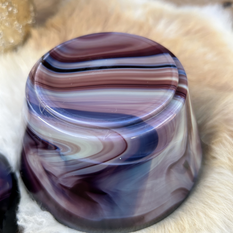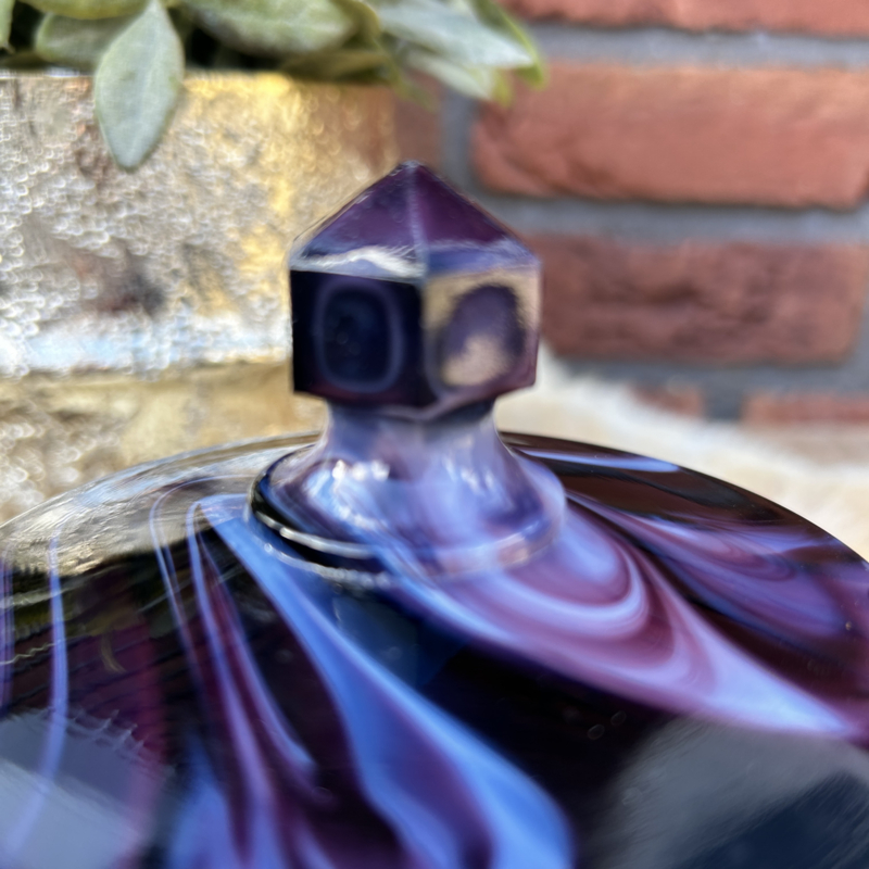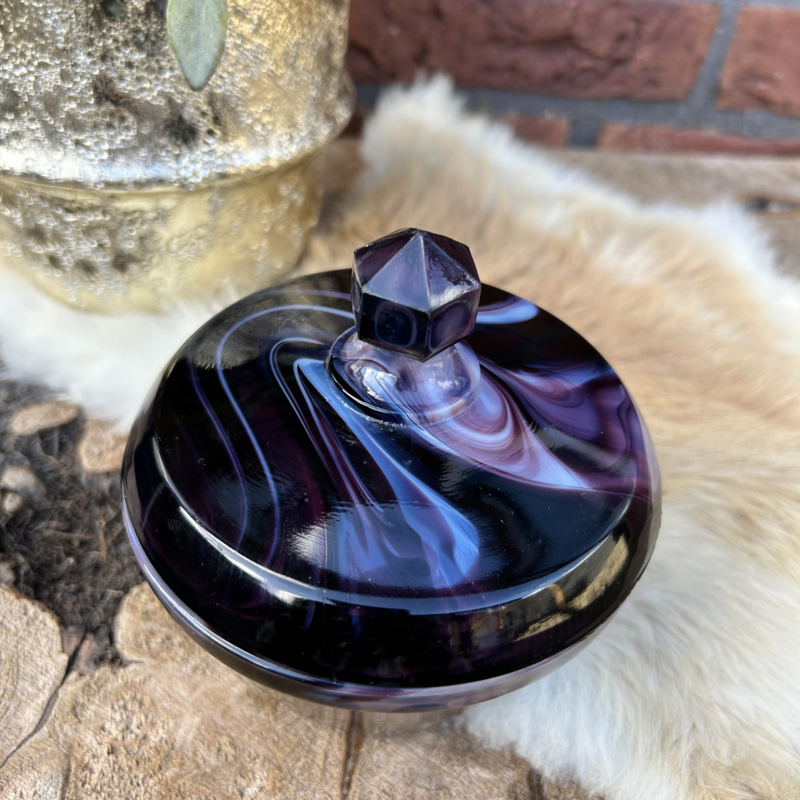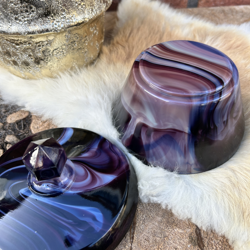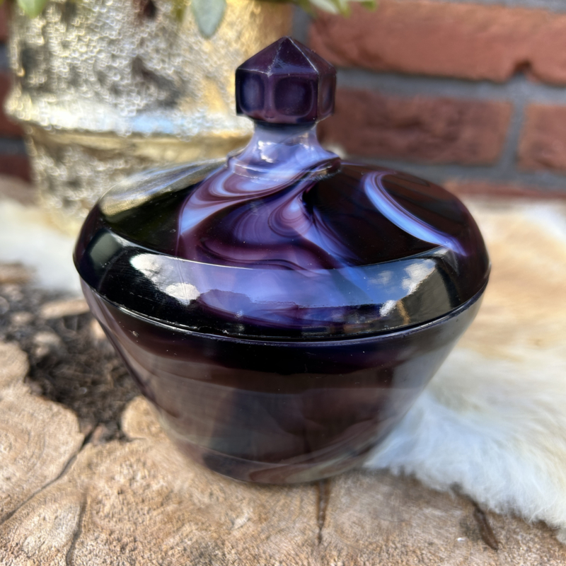 Prachtige marmorite bakje met deksel( waarschijnlijk onderdeel van een tabaksstel) uitgevoerd in persglas in donkerpaars met witte marmering.