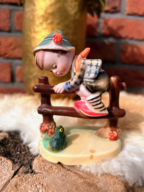 Vintage plastic figuurtje 'Hummel' achtig 'Jongetje op hek'Een lief hard plastic figuurtje, gelijkend aan de Hummel-figuurtjes, een jongentje die over een hek klimt, gadegeslagend door een groene kikker.