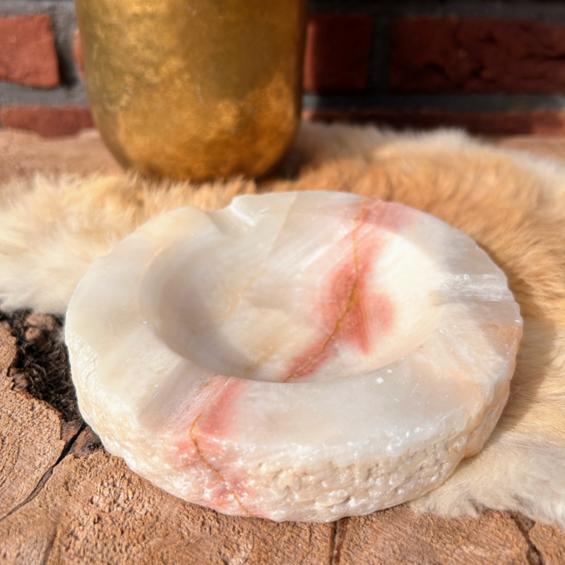 Vintage onyx stenen asbakGlad aan de boven en onderzijde en rondom is de asbak het authentieke steen, ruw en grillig. De mooieroomwitte kleur met roze adering is werkelijk prachtig♥